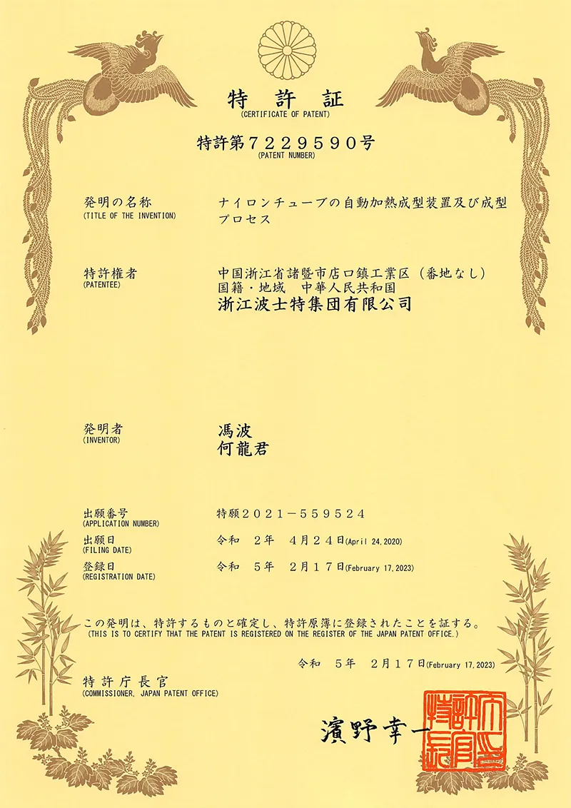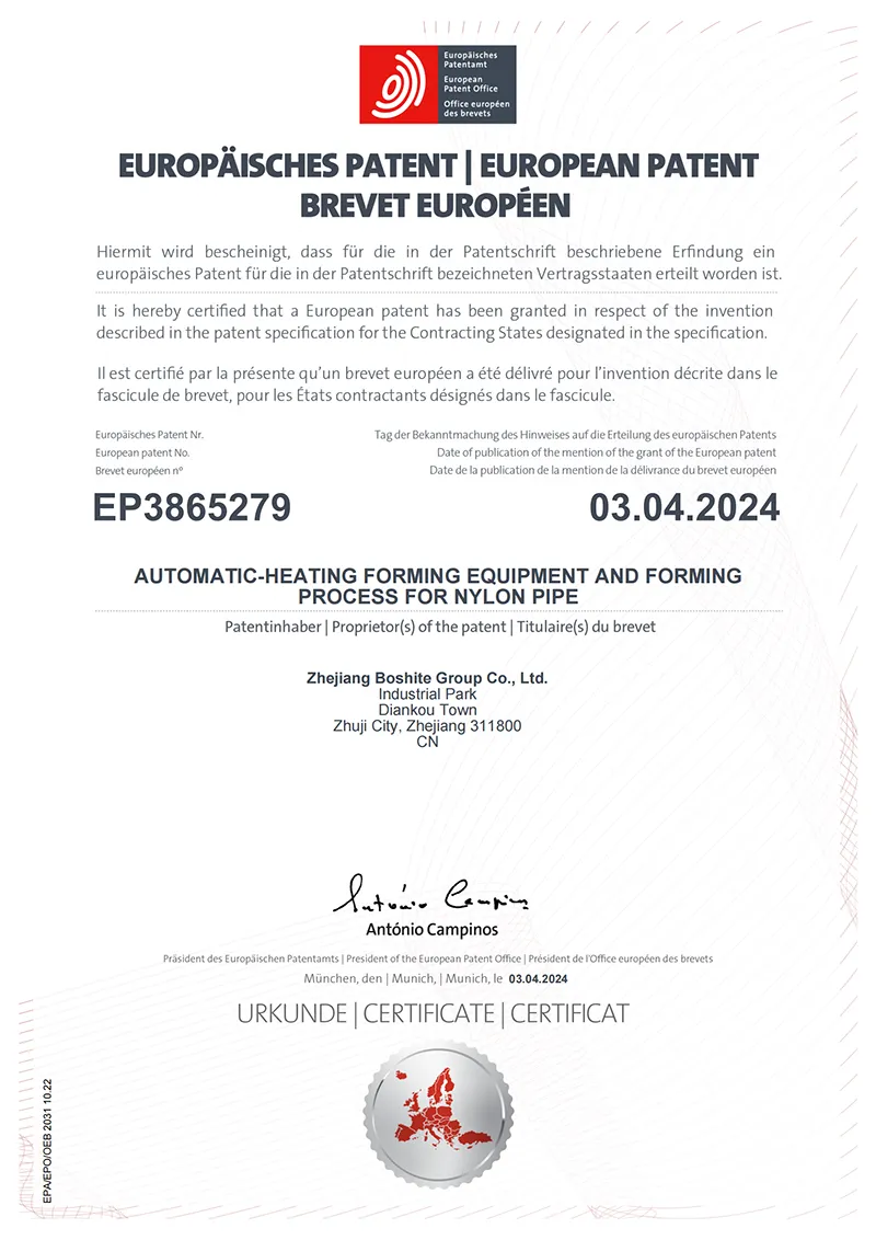 Manufactured using an innovative approach and sophisticated production techniques, our fully automatic thermoforming machine for bending nylon tubes has been granted with national invention patent, authorized for the invention patent applications in the United State, the European Union (EU) and Japan, and won the honorary title of "Zhejiang Province's First (Set) Equipment". With an annual production capacity of more than 200 sets, this nylon tube bending machine is remarkable by achieving a total revenue of nearly one hundred million RMB.